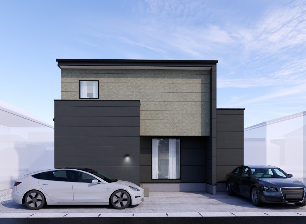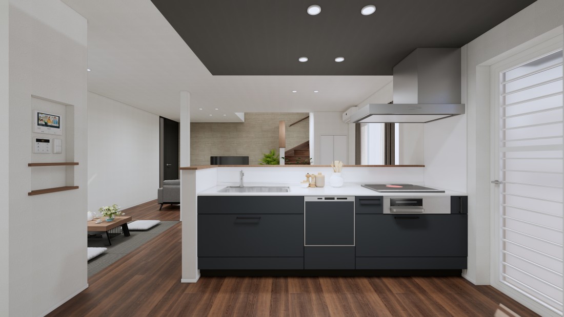 落ち着きあるグレー外観と、木目×白で仕上げた心安らぐモダンリビングの家