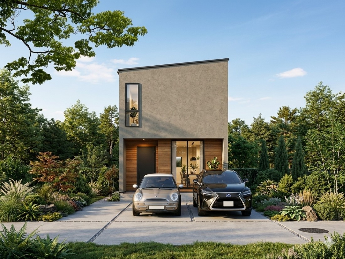 片流れ屋根が彩るクールな外観と、木目のアクセントが映えるモダンな玄関が魅力の一邸。