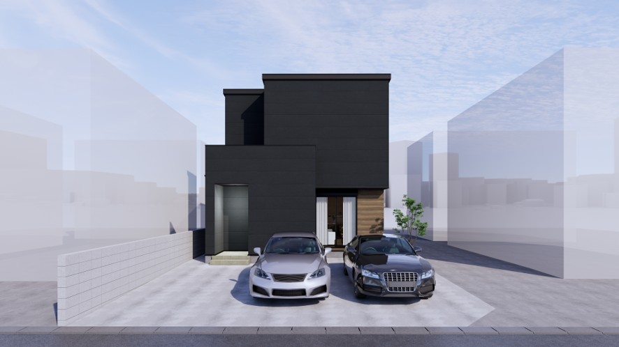洗練されたブラック外観と、光と木目が心地よいナチュラル空間の住まい。※パースはイメージです。