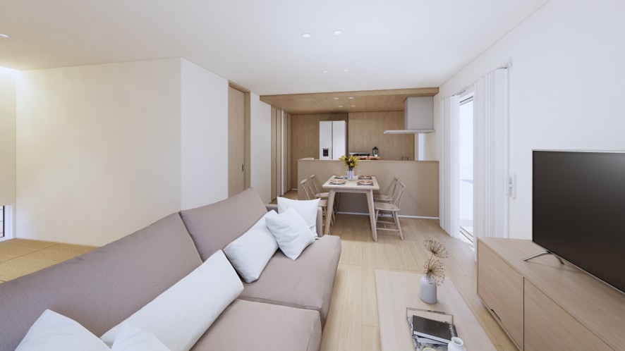 キッチンからリビング全体を見渡せるレイアウトで、毎日の会話も自然と弾む設計です。※パースはイメージです
