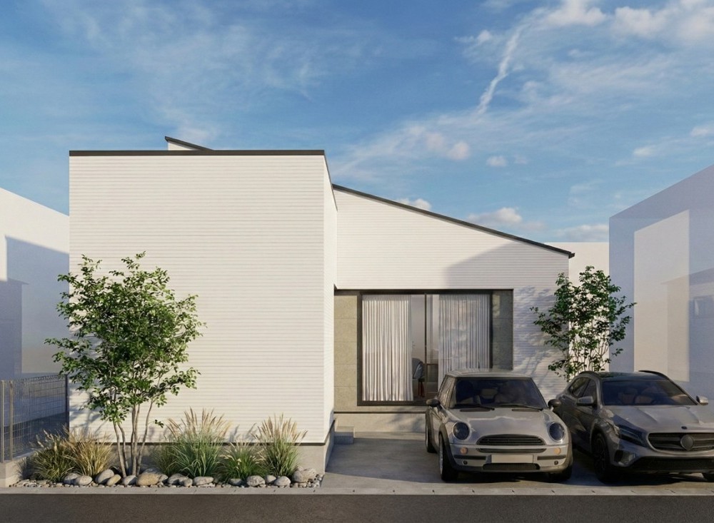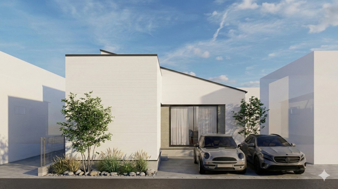 白を基調としたやわらかな外観に片流れ屋根が印象的なスタイリッシュな平屋デザイン