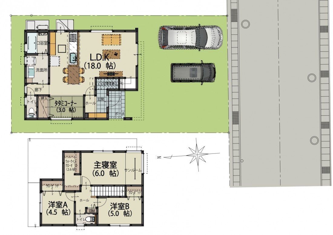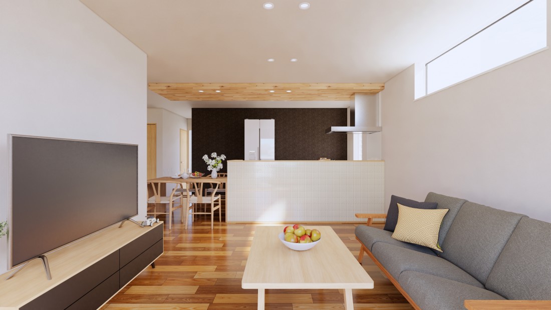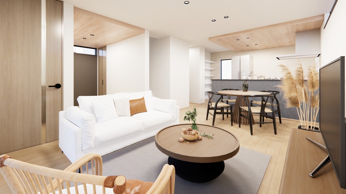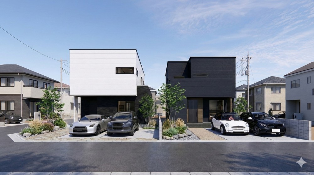 B号地:白とグレーの洗練された外観に、ナチュラルウッドが映えるインテリア。開放感あふれるリビングと落ち着きある寝室が、上質な日常を演出します。