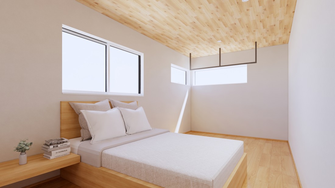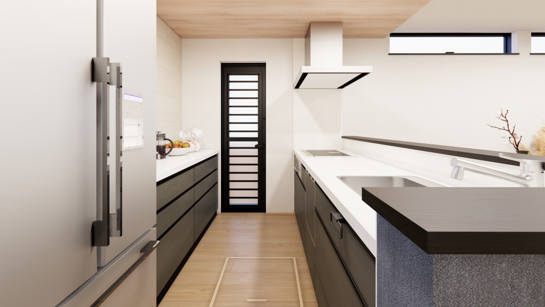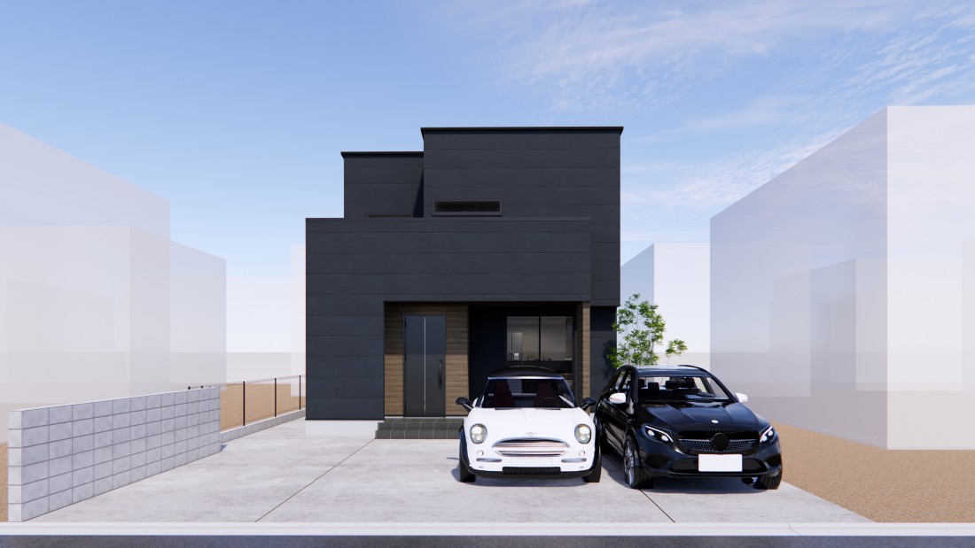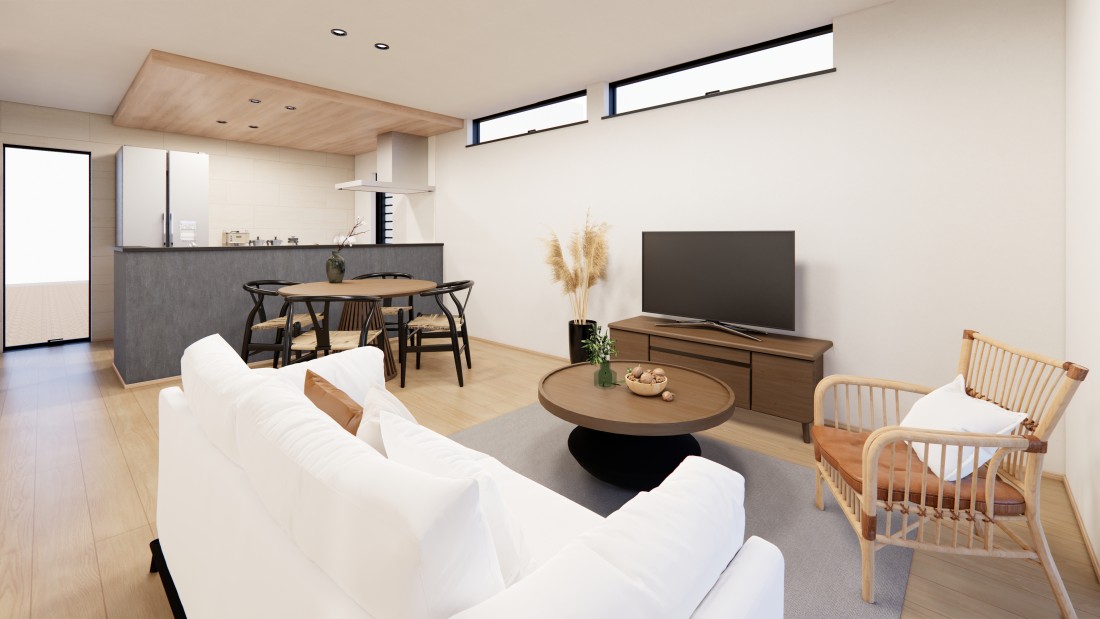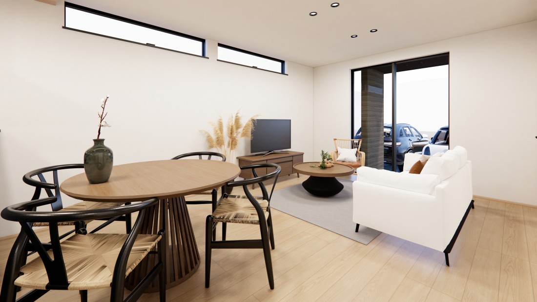 A号地:端正なキューブ型の外観に、やわらかな光が広がるLDKと心地よい主寝室。内と外が調和した、都会的で洗練された住まい。