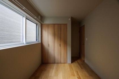 主寝室にも木目の壁紙を使用し、おうち全体に統一感を持たせました。