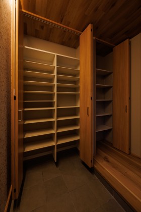 玄関は無垢の木の風合いのフローリングに塗り壁調のクロスで和モダンに魅せています。収納スペースもしっかり確保。