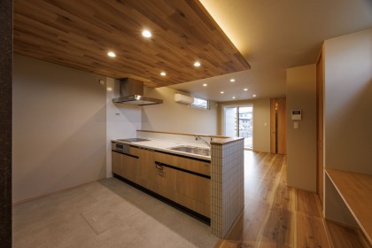キッチン前にタイルを使用し、クロスでは表現できない素材感を出しました。