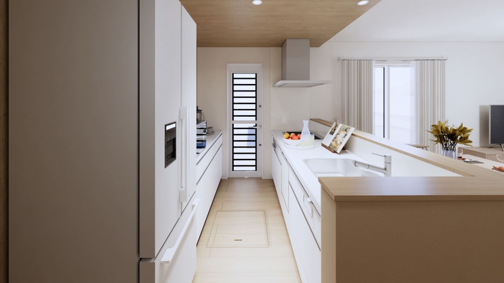 キッチンからリビング全体を見渡せるレイアウトで、毎日の会話も自然と弾む設計です。※パースはイメージです