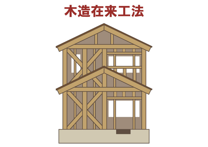 一般的な木造住宅に多い、在来工法で建築しています。 筋違いで補強する他、構造用合板を用い、耐震性、耐風性を高めています。