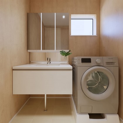 フロートタイプの洗面台は、鏡裏や洗面下も収納たっぷりで見た目もすっきりです。※パースはイメージです。
