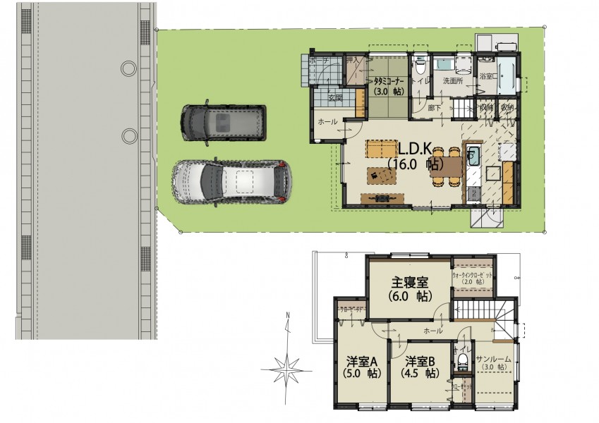 | 設備 | 駐車場2台可 / タタミコーナー /システムキッチン / 浴室乾燥機 / 全居室収納 / 対面式キッチン / LDK17.0帖 / 浴室1坪以上 / 床下収納 / TVモニター付インターホン / ウォークインクローゼット / サンルーム / 食器洗乾燥機 / IHクッキングヒーター / 玄関収納 / オール電化 | ||
