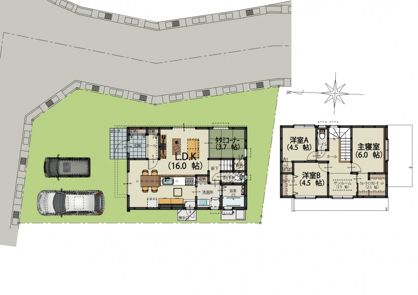 | 設備 | 駐車場2台可 / システムキッチン / 浴室乾燥機 / 全居室収納 / WIC / 対面式キッチン / LDK16帖 / タタミコーナー / 浴室1坪以上 / 物干しスペース / 床下収納 / 浴室に窓 / TVモニター付インターホン / IHクッキングヒーター / 食器洗乾燥機 /ピタットキー | ||