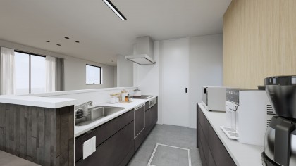 キッチン横に勝手口があり、ゴミ出しや外収納への出入りがスムーズ。※パースはイメージです。