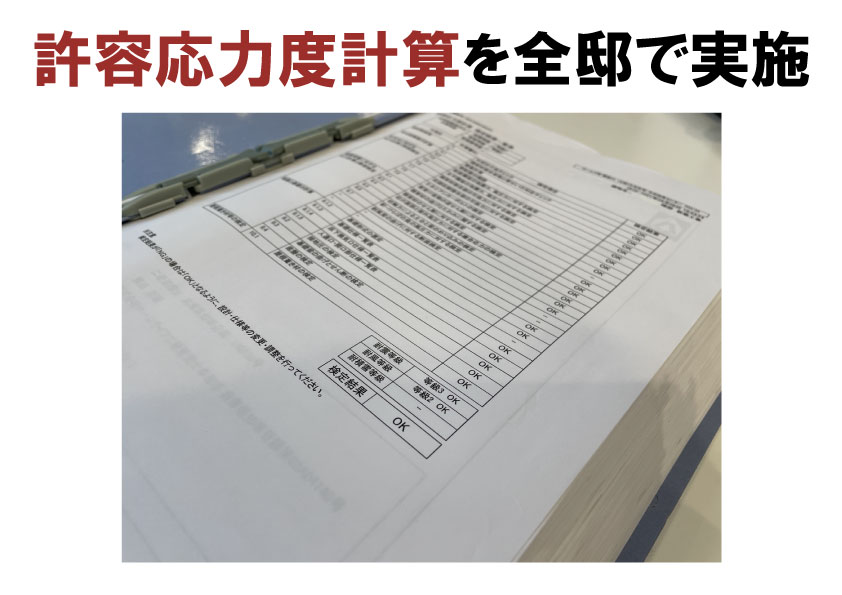 建物の各部材に外部から力がかかった時に損傷が生じないかを確認したものです。 災害時などにおうちがどこまで耐えられるかを計算により数値化しています。