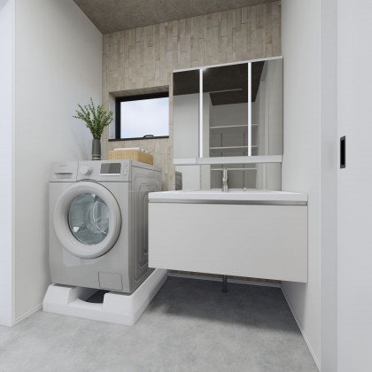 フロートタイプの洗面台は、鏡裏や洗面下も収納たっぷりで見た目もすっきりです。※パースはイメージです。