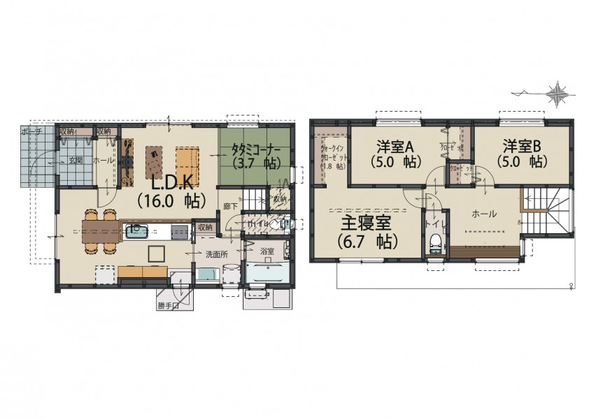 LDK横に3.7帖のタタミコーナーがあり、キッズスペース・お昼寝・客間など多用途に使えます。※パースはイメージです。
