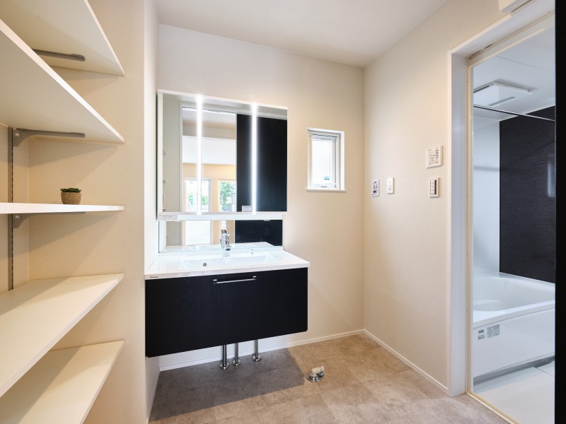 洗面脱衣室には、タオルや洗剤などたっぷりストックできる収納スペースを設けました!