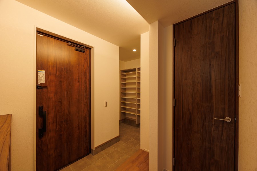 普段使いの靴はシューズボックス、ベビーカーやアウトドアグッズなどは奥の土間収納へ収納可能。
