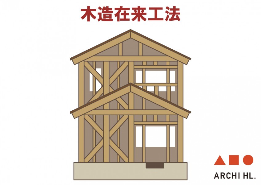 一般的な木造住宅に多い、在来工法で建築しています。 筋違いで補強する他、構造用合板を用い、耐震性、耐風性を高めています。