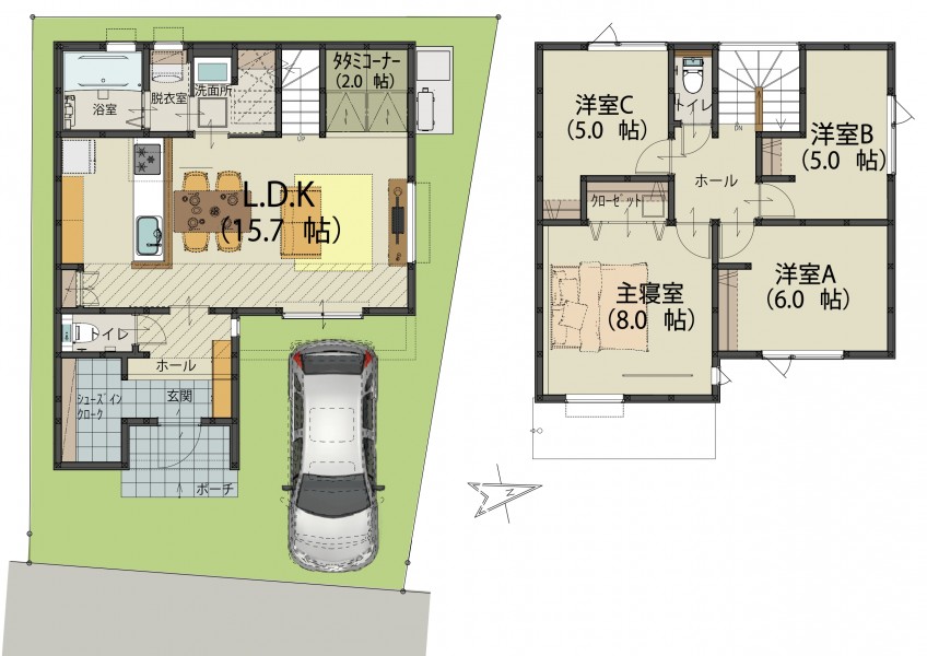 | 設備 | リビング階段 /システムキッチン / 全居室収納 / LDK15.7帖 / タタミコーナー / トイレ2ヶ所 / シューズインクローク / 2階建 / 床下収納 / 浴室に窓 / TVモニター付インターホン / 食器洗乾燥機 / 浴室乾燥機 / オール電化 / ピタットキー | ||