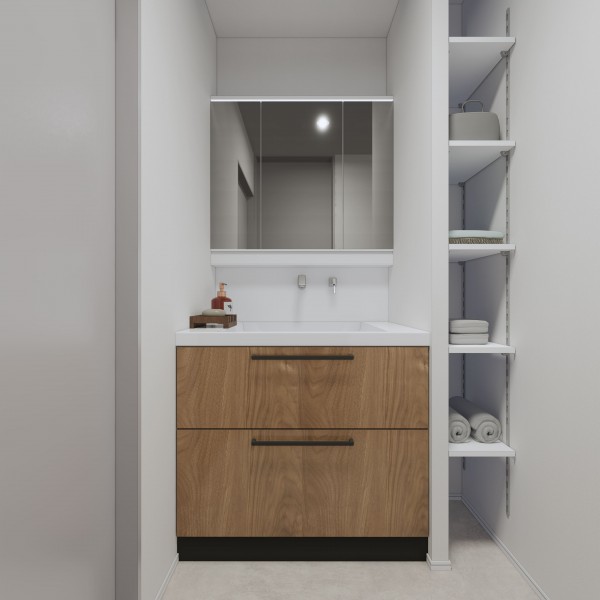 洗面室には棚があり、洗剤やタオルを 収納いただけます。※パースはイメージです