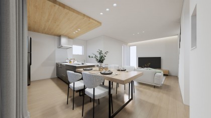キッチンからダイニングへ流れるような動線で、お食事の準備も片付けもスムーズです。※パースはイメージです