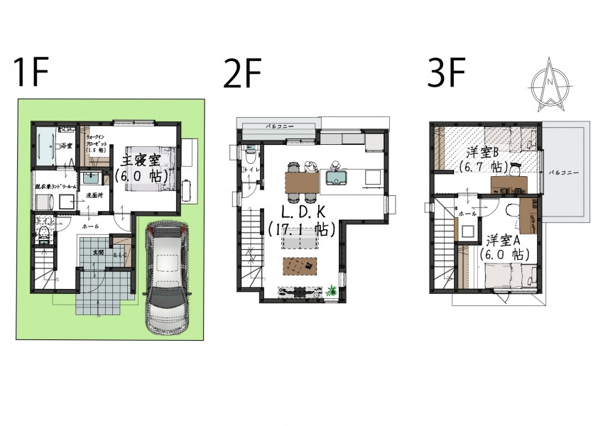 | 設備 | 駐車場2台可 / LDK17.1帖 / リビング階段 /全居室収納 /オープンキッチン /トイレ2ヶ所 / 浴室1坪以上 / 3階建 / 床下収納 / TVモニター付インターホン / 浴室乾燥機 / 食器洗乾燥機 / ピタットキー | ||